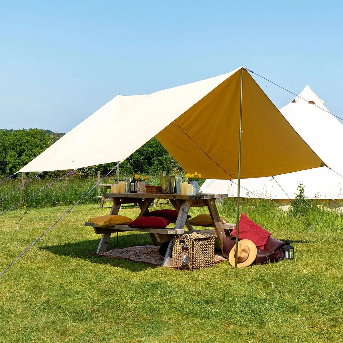 This polycotton (285gsm/9oz) attachment will hook effortlessly onto the tent’s external a-frame spike, creating a beneficial sheltered area to store belongings and host shaded magical moments under. Weighing less than 10kg, and with only one pole to erect it is very simple to assemble and easy to transport. The awning also comes with a second adjustable pole which allows double-ended stability when used as a stand-alone shelter, you will require x1 additional guy rope for stand-alone technique.