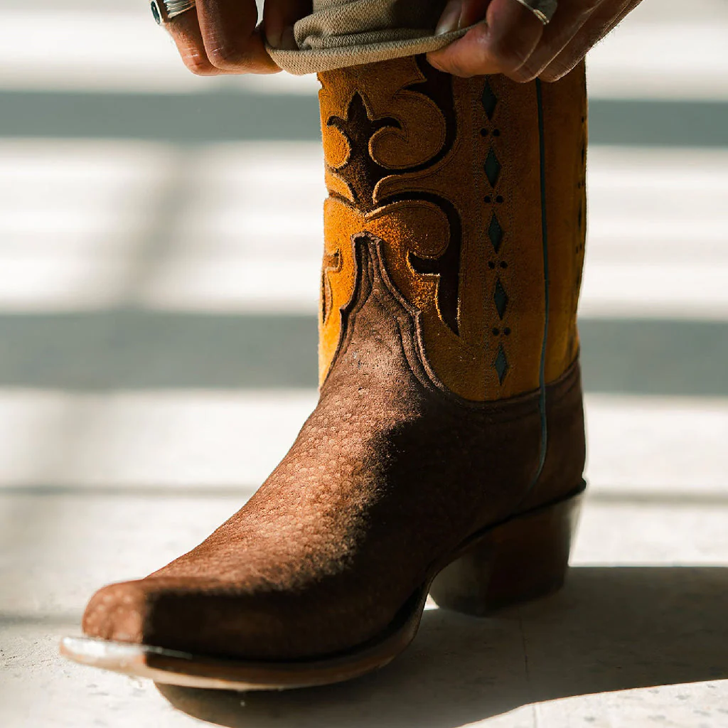 Usando solamente pieles suaves de la mayor calidad y pieles exóticas, Lucchese construye su bota diseñada para abrazar el pie de la persona gracias a las suelas exclusivas que usan. Para un toque final perfecto, nuestros expertos fabricantes de botas usan una variedad de técnicas para los terminados que incluyen dar un terminado de usado, detallar las orillas y pintado a mano.