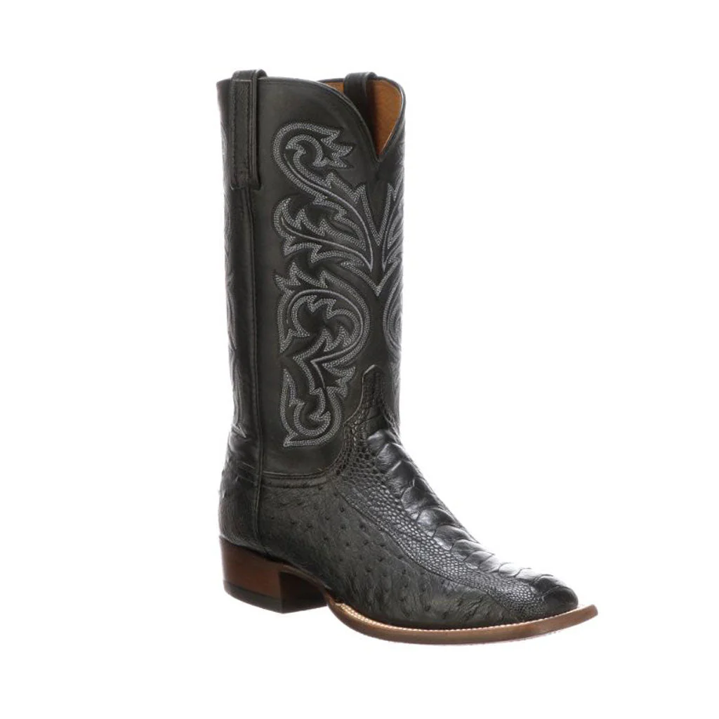 - Stewart es bota para hombre de a caballo exótica, construida con pata de avestruz lisa. Una horma cuadrada exclusiva de Lucchese y un bordado tradicional en el tubo ofrece un estilo que se puede usar para trabajar o para salir.