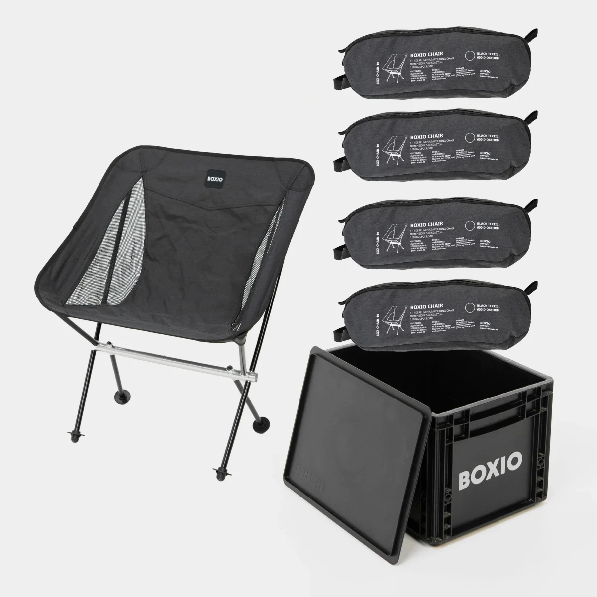 Una silla de camping ultraligera y resistente para viajar: pesa sólo 1,2 kg, soporta hasta 150 kg y se pliega de forma compacta. Se suministra con una bolsa de transporte y está diseñada para que quepan cuatro piezas en el BOXIO SOLO suministrado – perfecta para viajes minimalistas, vida en furgoneta y momentos de relax en la naturaleza.