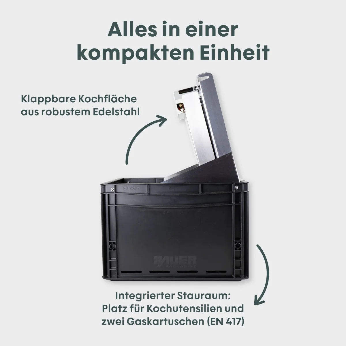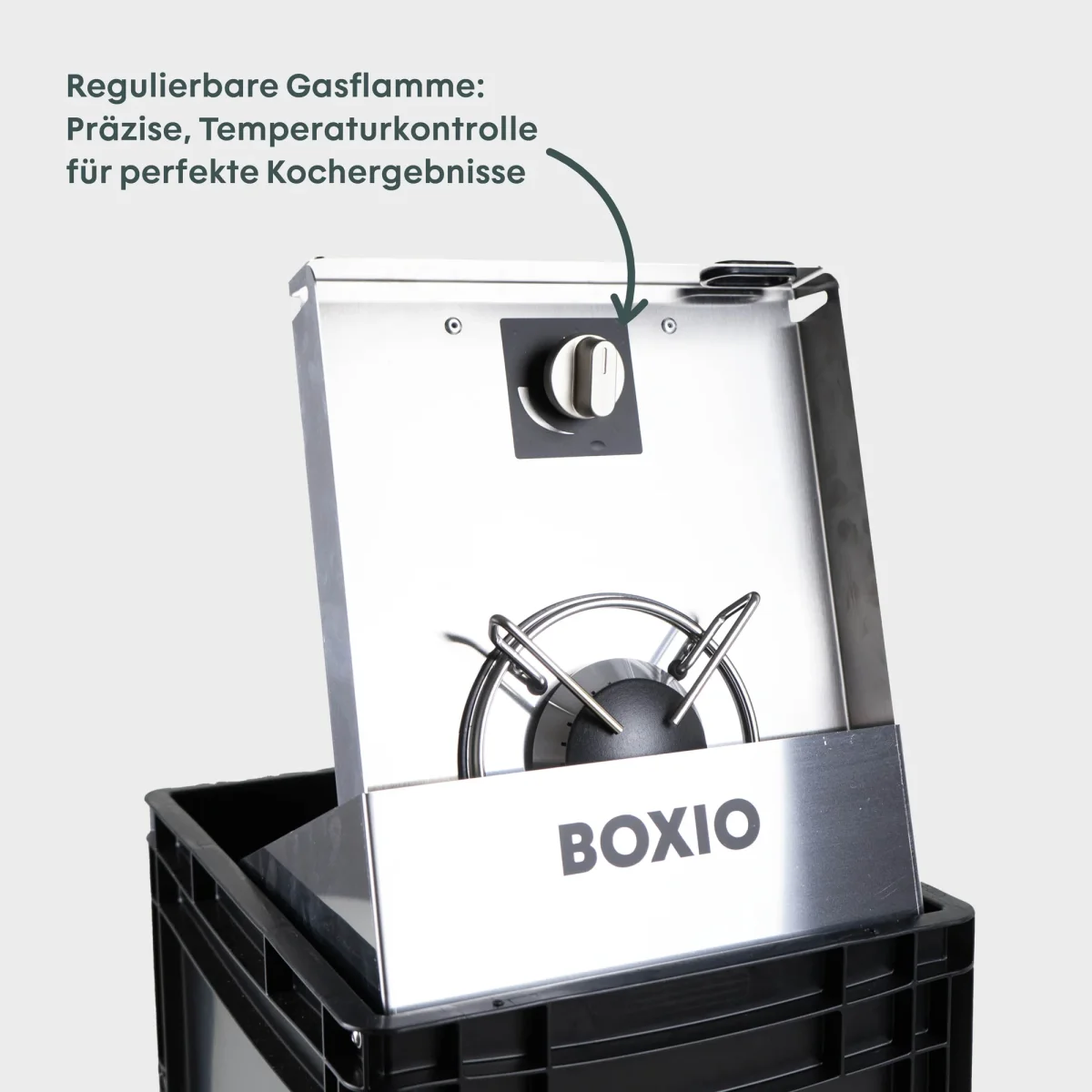 Con una potencia de 1500 vatios, la BOXIO COOK establece nuevos estándares de eficiencia e independencia en las cocinas de camping. La llama regulable permite una cocción precisa, mientras que su robusta construcción garantiza estabilidad, seguridad y resistencia al viento. La BOXIO COOK no es solo una cocina, sino una solución integrada para guardar tus utensilios de cocina y botellas de gas, todo perfectamente apilado en una práctica Eurobox con los innovadores clips BOXIO que aseguran una unión firme y segura.
