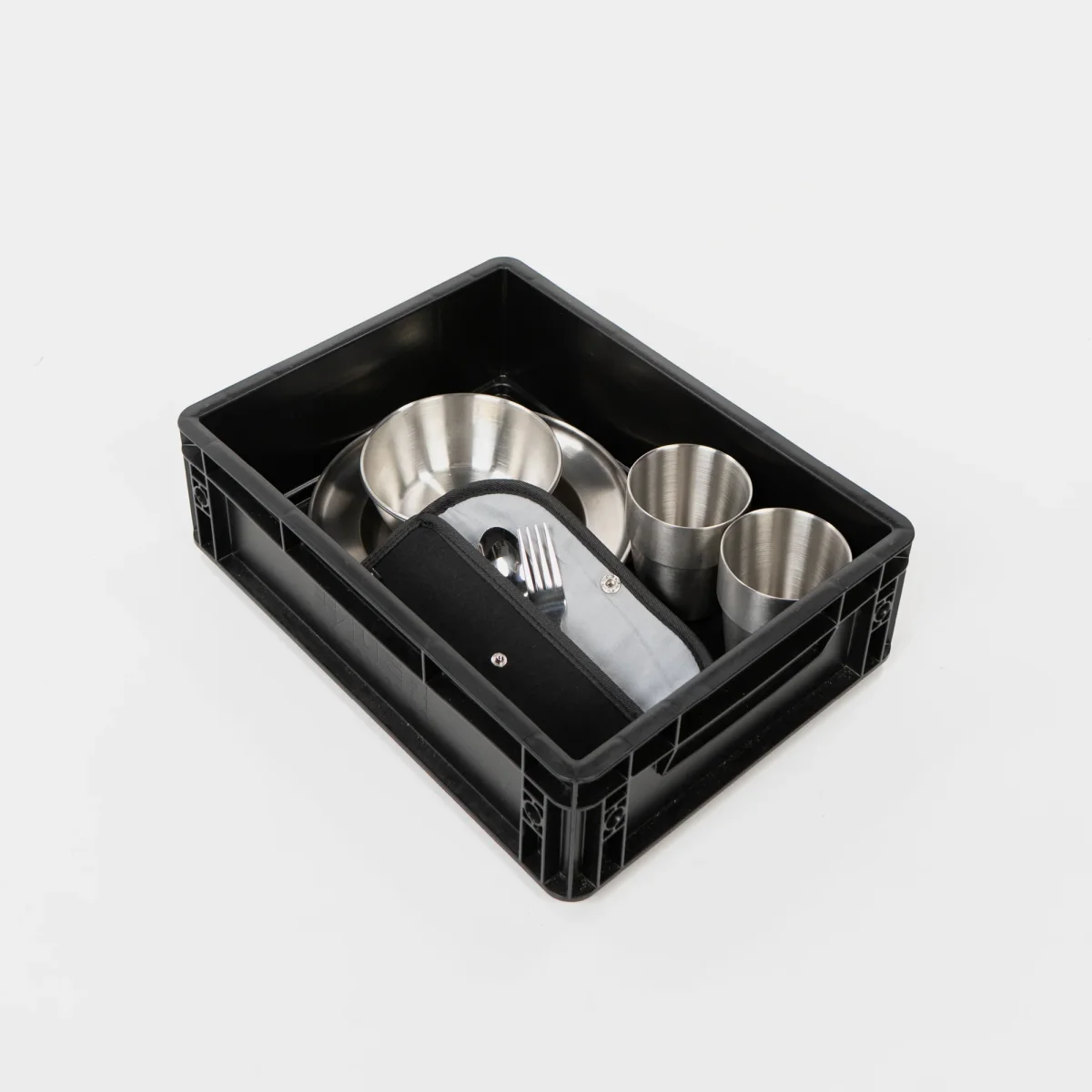 BOXIO COOK UP es el set completo de vajilla y menaje para 4 personas: robusto, elegante y perfecto para viajar. Ya sea en furgoneta camper, de acampada o de picnic, con cuatro tazas de acero inoxidable, cuatro platos, cuatro cuencos, cuatro juegos de cubiertos y la bolsa de transporte a juego (EAT BAG), tendrás todo lo que necesitas. Empaquetado en la práctica Eurobox BOXIO SOLO UP: apilable, fácil de transportar y pensada para el uso diario.