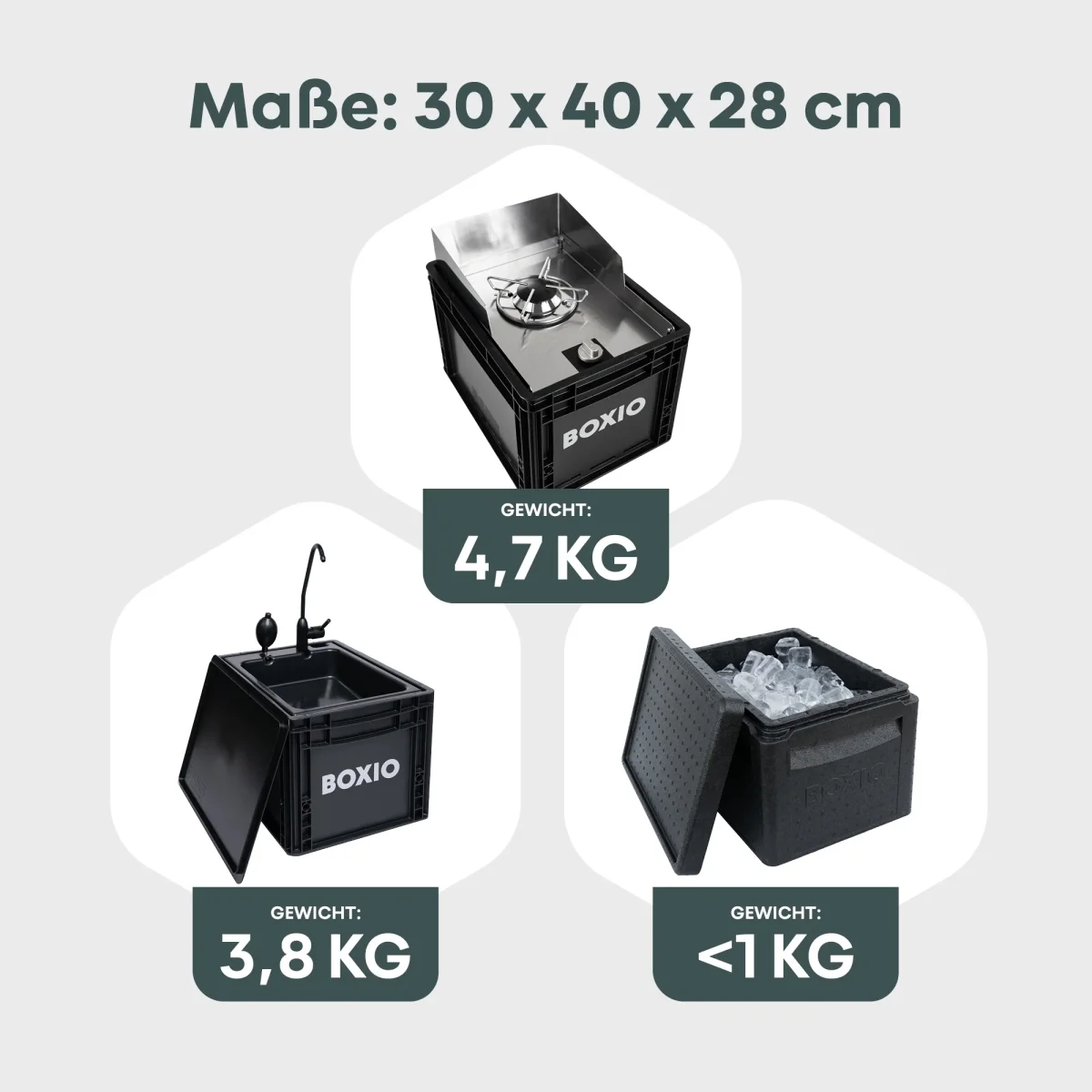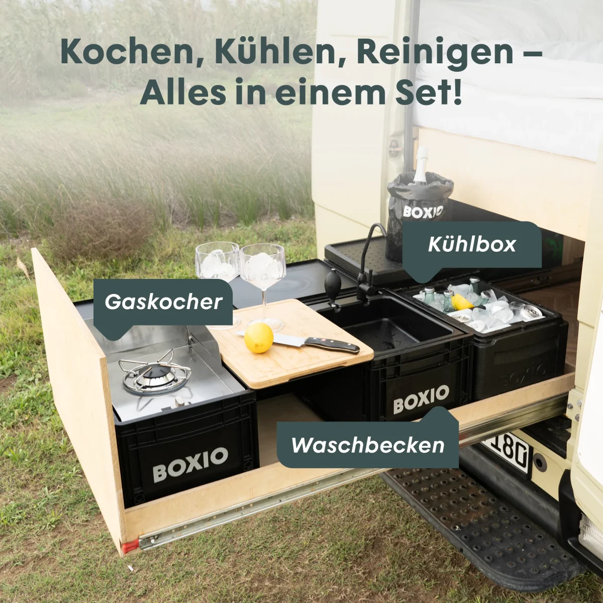 Experiencia completa con el Pack de cocina BOXIO: la cocina exterior perfecta, ¡totalmente equipada para tu aventura! Este conjunto bien pensado ofrece todo lo necesario para cocinar, almacenar y organizar sobre la marcha: