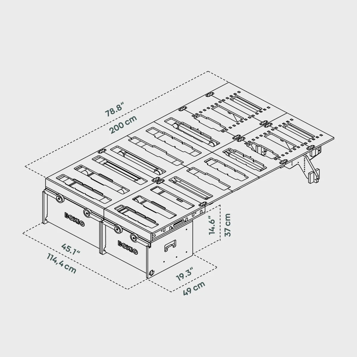 El BOXIO RACK Bundle es la ampliación modular ideal para su furgoneta o monovolumen: flexible, bien pensada y que ahorra espacio. Puede plegar la BOXIO BED en la RACK BOX en un abrir y cerrar de ojos para ahorrar espacio. Hay espacio para hasta tres BOXIO en la RACK BOX. Cuando está desplegada, la tapa sirve como una práctica superficie de trabajo, perfecta para su cocina móvil al aire libre.