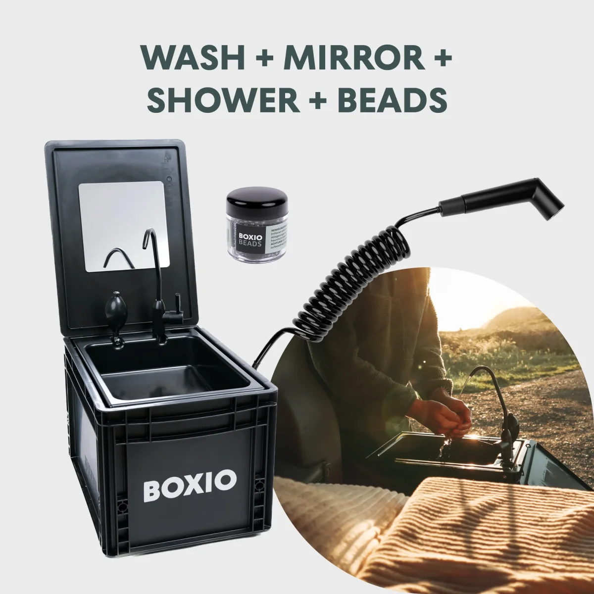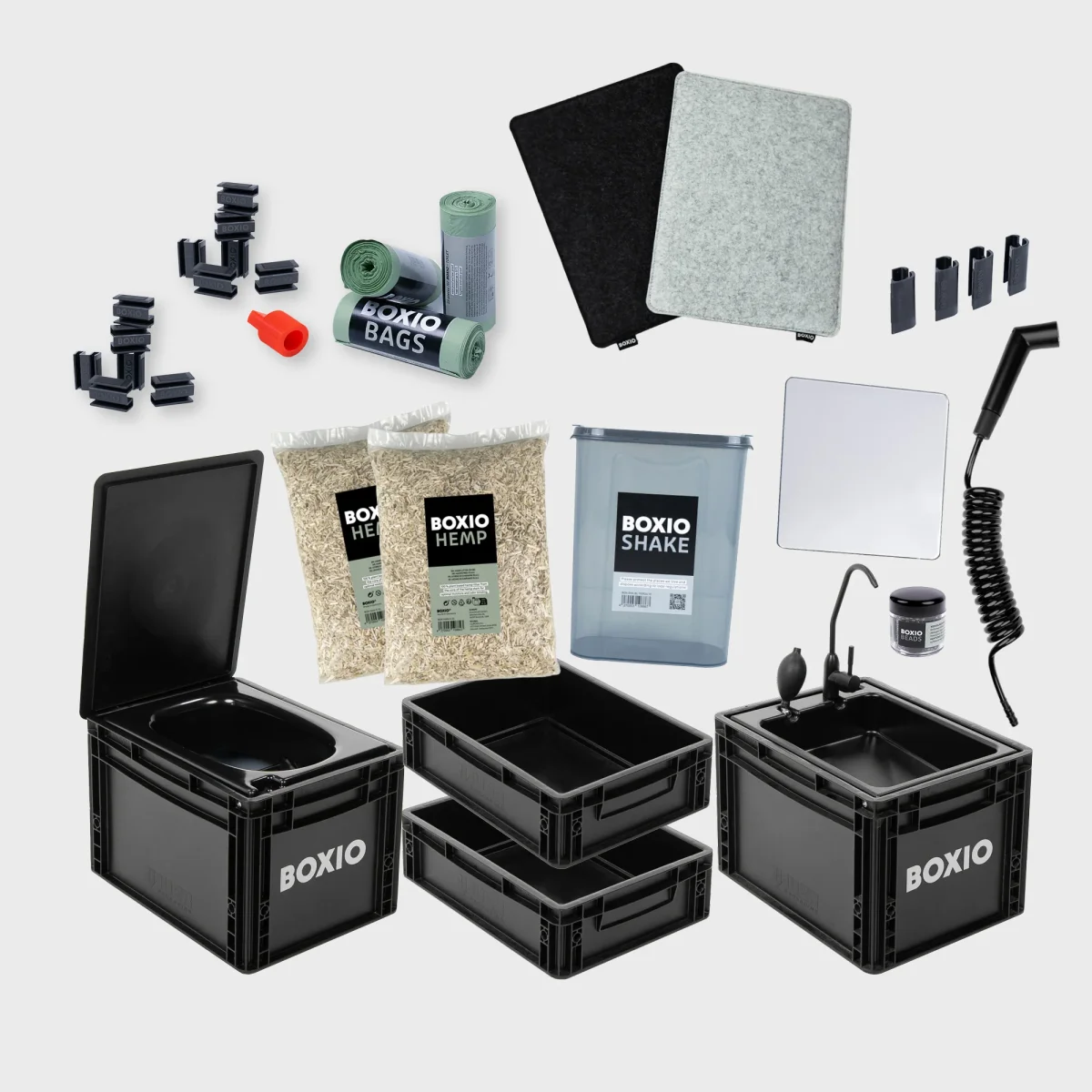 • Todo incluido: BOXIO Wash, BOXIO Toilet Max+, BOXIO Solo Up, BOXIO Mirror, BOXIO Shower, BOXIO Sit, BOXIO Beads, BOXIO Fix – su baño móvil en sólo dos Euroboxes.