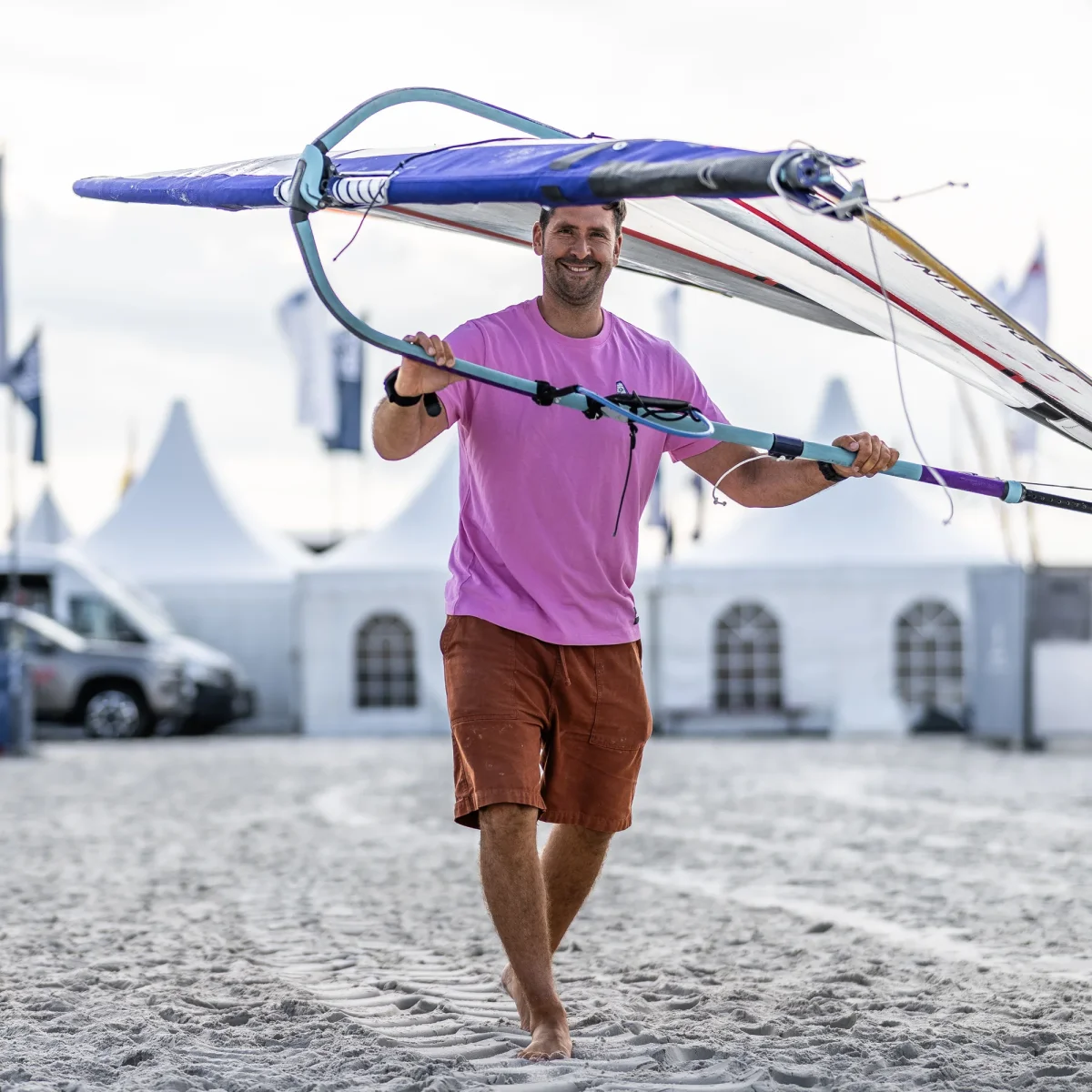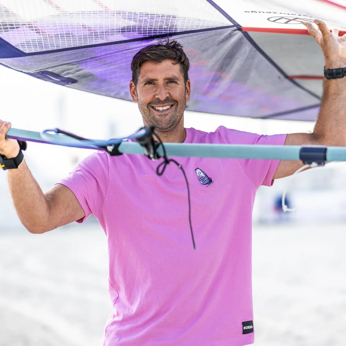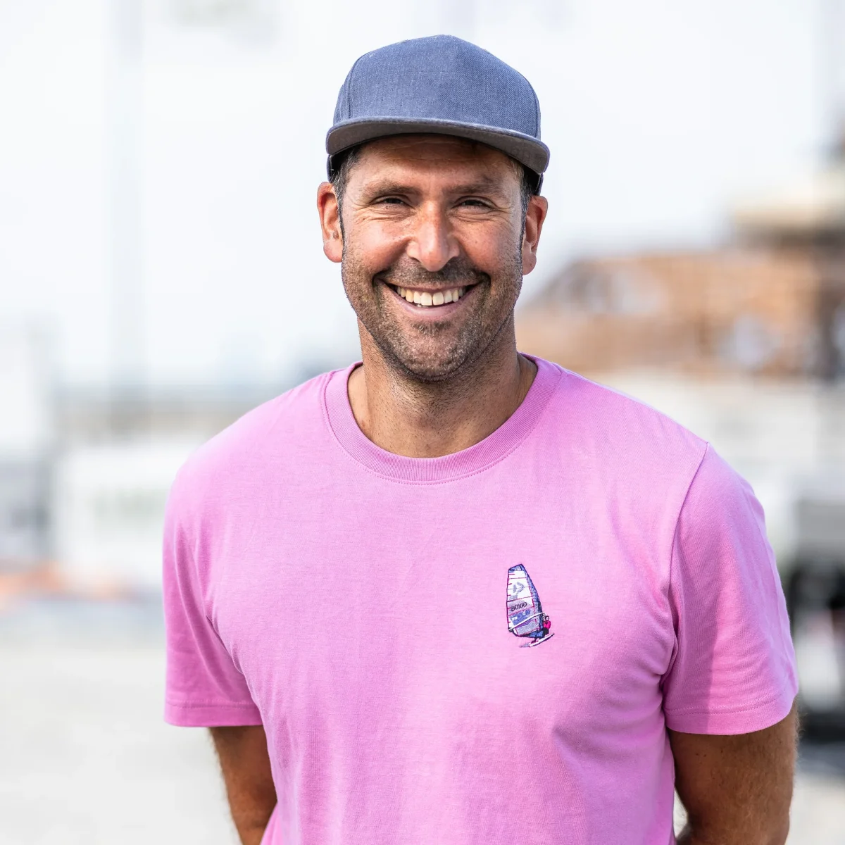 Camiseta de algodón certificado con bordado de la tabla de windsurf de Vincent Langer.