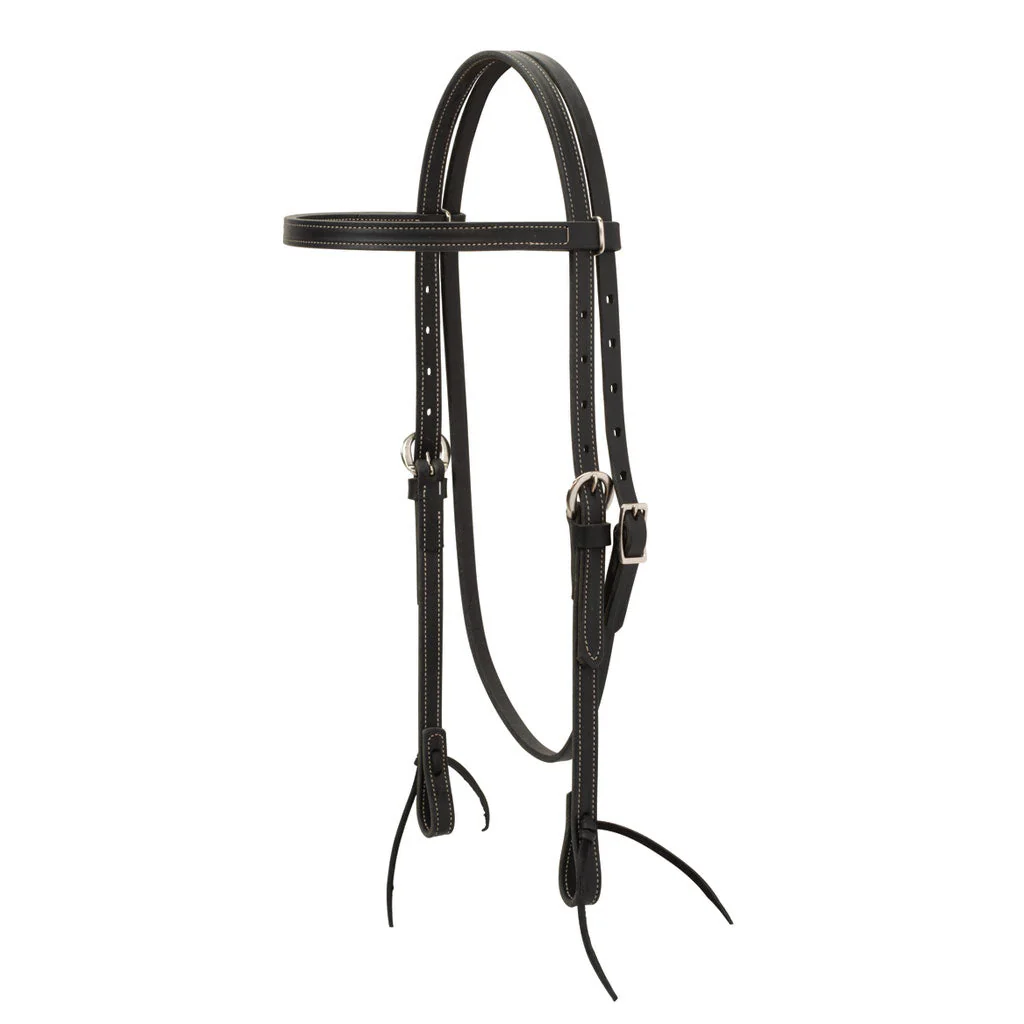 Hecho a mano de una sola capa de 5/8 «de cuero 100% natural de curtido vegetal en caliente en un color negro clásico, esta cabezada tiene una frontalera doblada y cosida y lazos de cuero negro en los extremos del bocado. Herrajes niquelados duraderos. Tamaño del caballo.