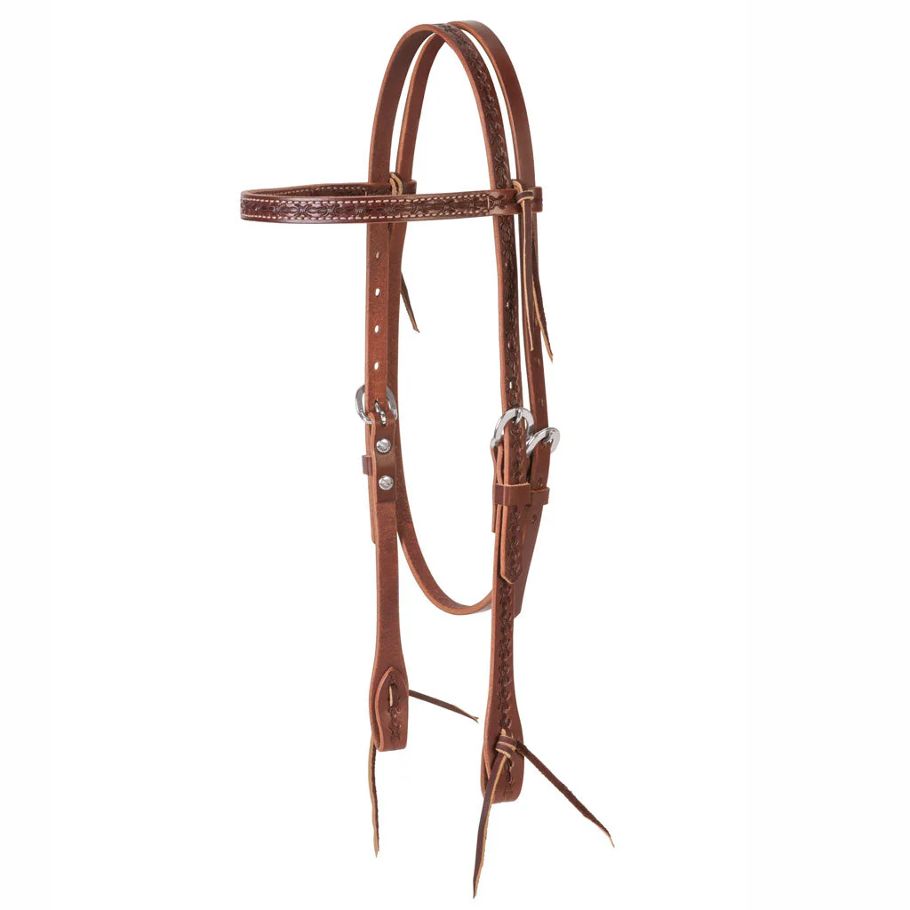 Fabricada a mano en cuero marrón, esta cabezada de una sola capa de 5/8» presenta un nítido y profundo diseño de alambre de espino en relieve en la frontalera, la corona y las mejillas para un aspecto clásico. Tanto si pasas el día en el sendero como en el rancho, esta cabezada ofrece un rendimiento en el que puedes confiar. Cordones marrones curtidos al alumbre en los extremos de los bocados. Herrajes de acero inoxidable. Talla del caballo.