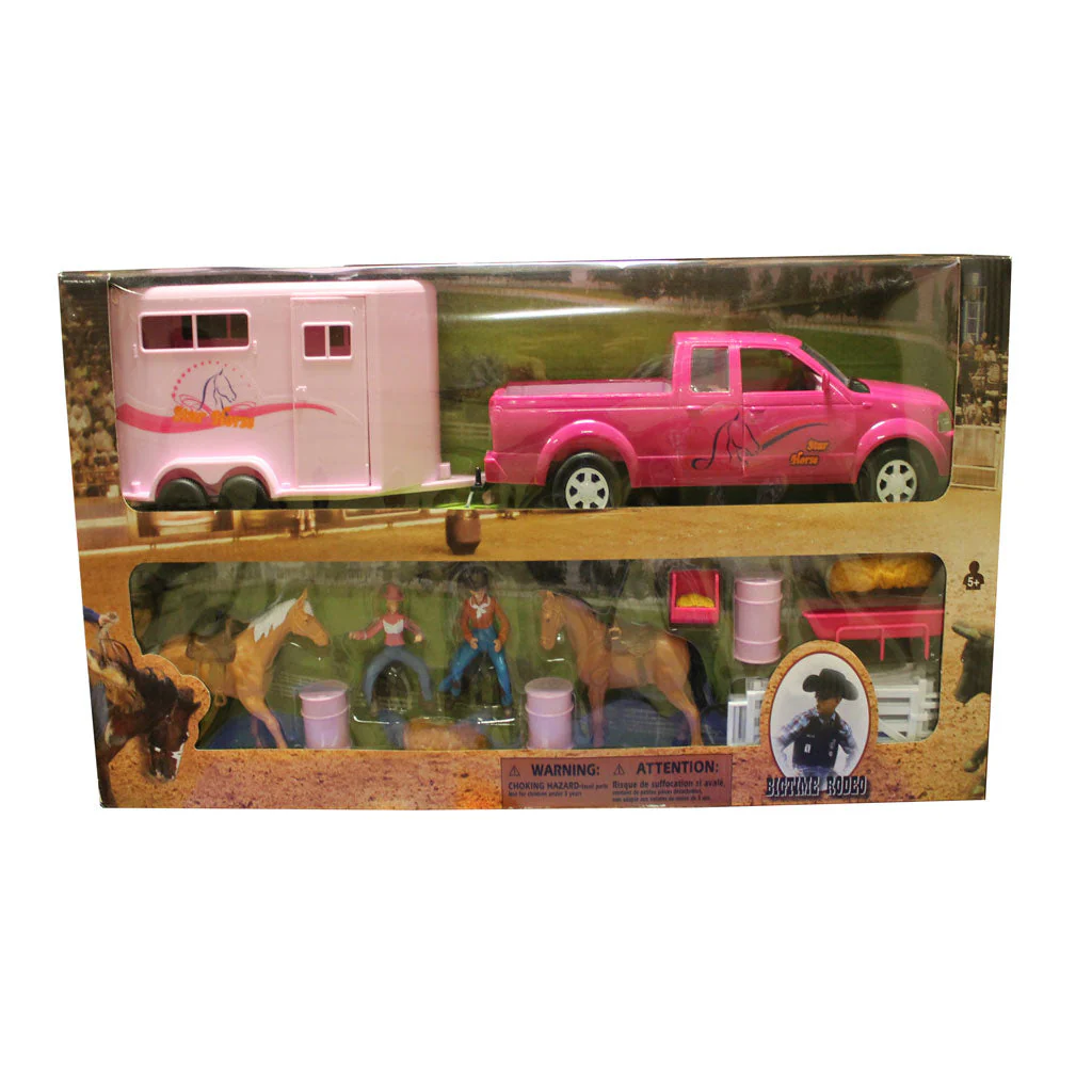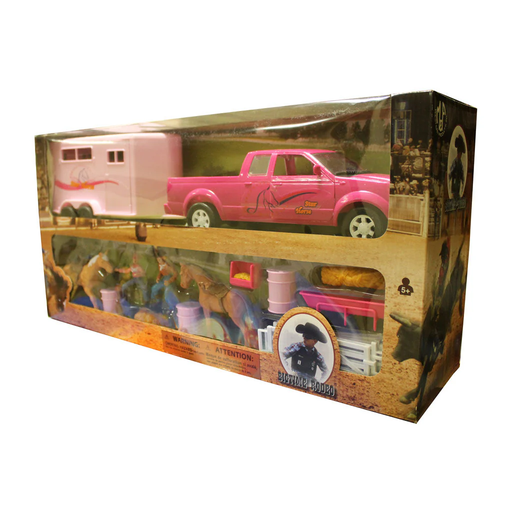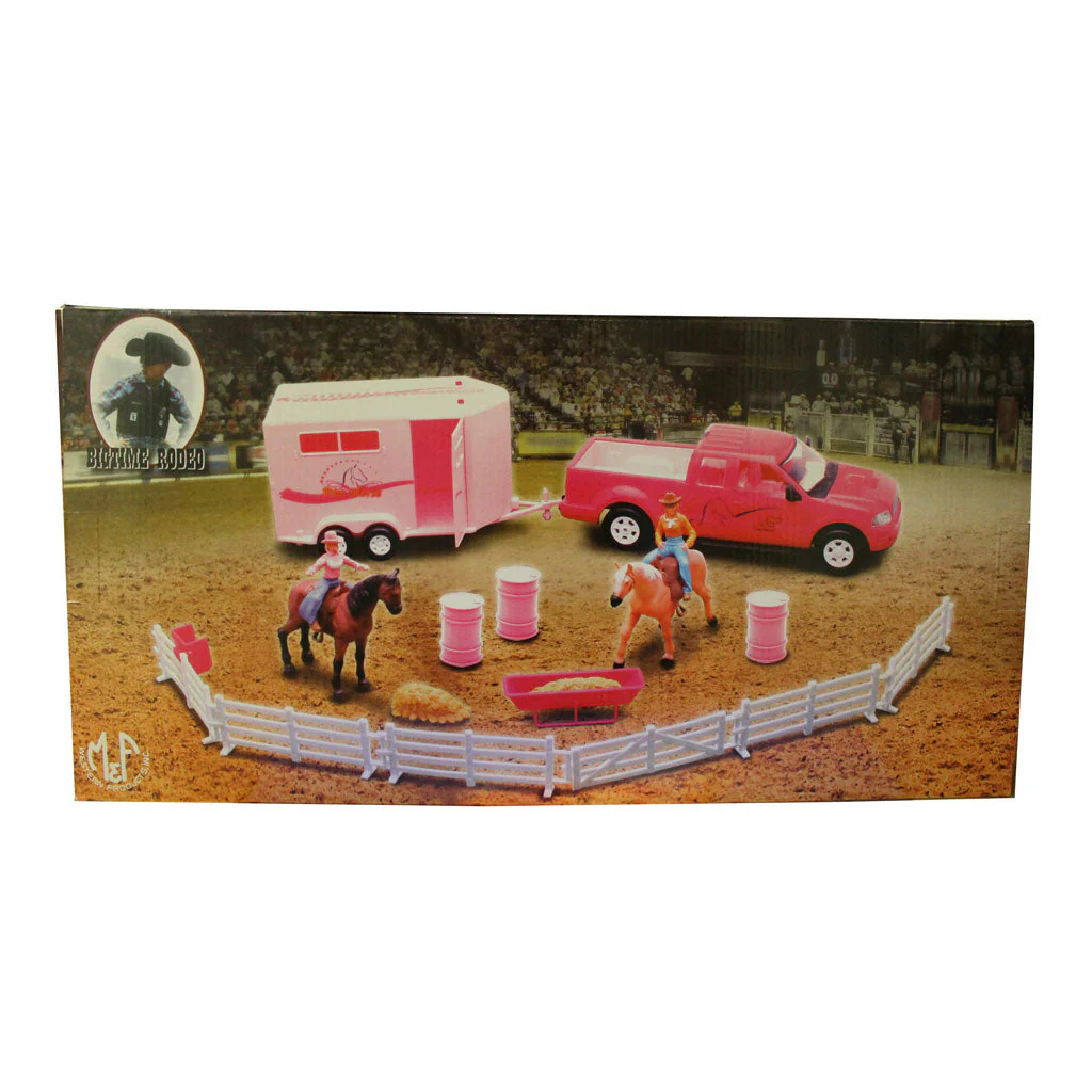 MF Western Products Big Time Rodeo Ford Lobo Con Remolque Para 2 caballos y monturero. Es el regalo perfecto que incluye la camioneta, remolque, juego de barriles, caballos y todo lo necesario para tener un día lleno de diversión.