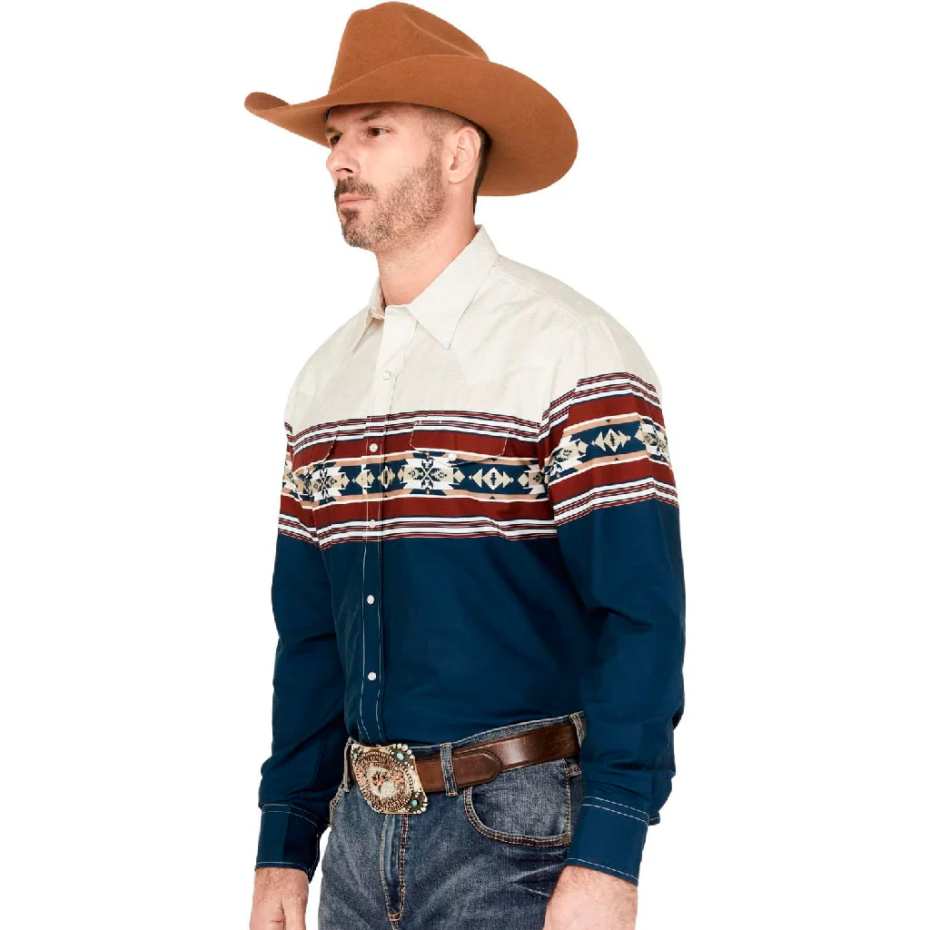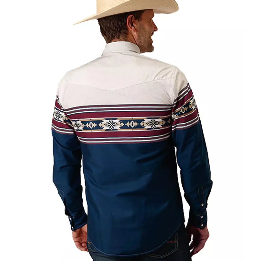 Un estilo rústico del oeste que recordarán! Esta camisa vaquera de manga larga para hombre de la colección Vintage de Roper presenta un llamativo estampado Black Hawk Border sobre popelina de algodón. Los detalles adicionales incluyen un cuello abierto, bolsillos de ribete con solapas con botones a presión de un punto y canesú delantero y trasero de un punto. También cuenta con un cierre frontal con botones a presión y dos puños con botones a presión.