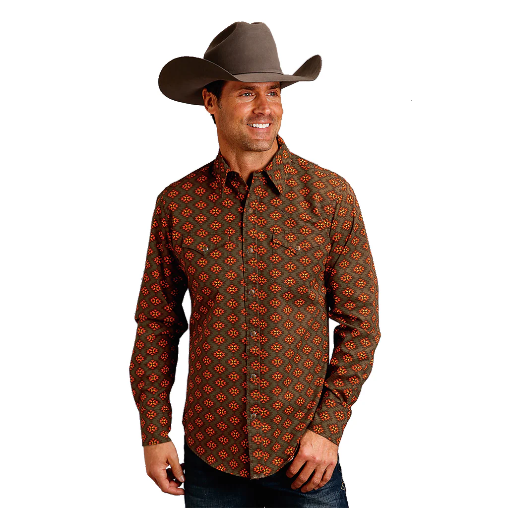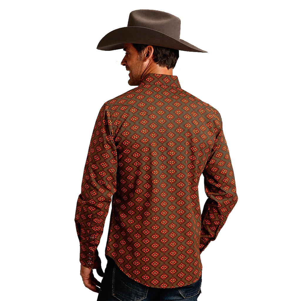 - Camisa color café, con detalles en naranja.