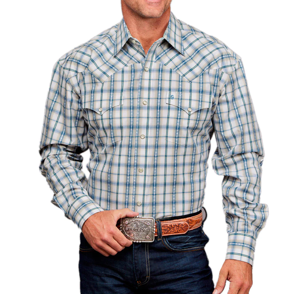- Camisa Stetson color beige y estampado de cuadros con franjas en varios tipos de azul