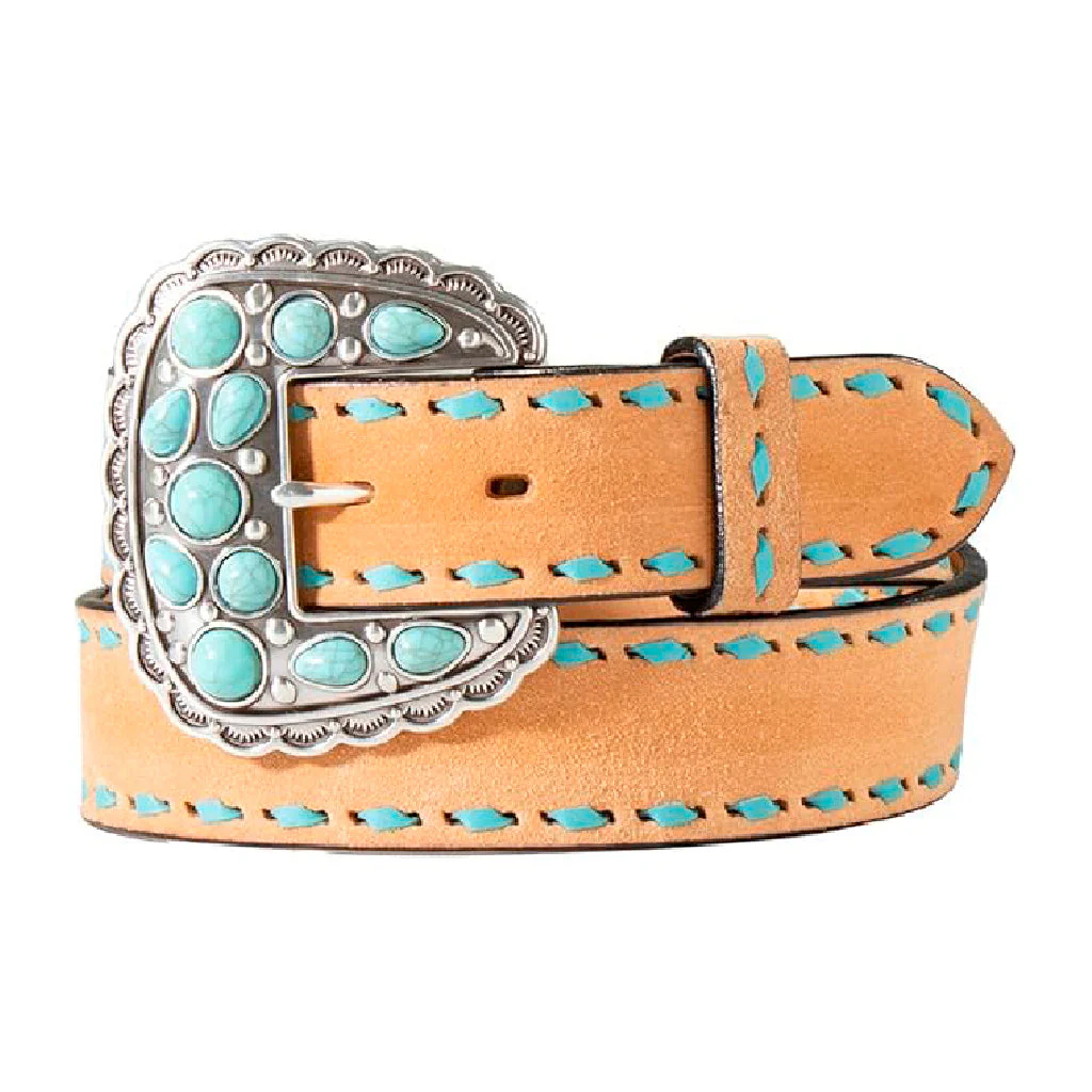 Cinturón para dama Angel Ranch de M&F Western Products. Cuerpo de cuero genuino color canela con pespuntes de buck trenzados en turquesa a ambos lados. Hebilla festoneada personalizada con acabado en plata antigua, con turquesas de diversas formas y tamaños.