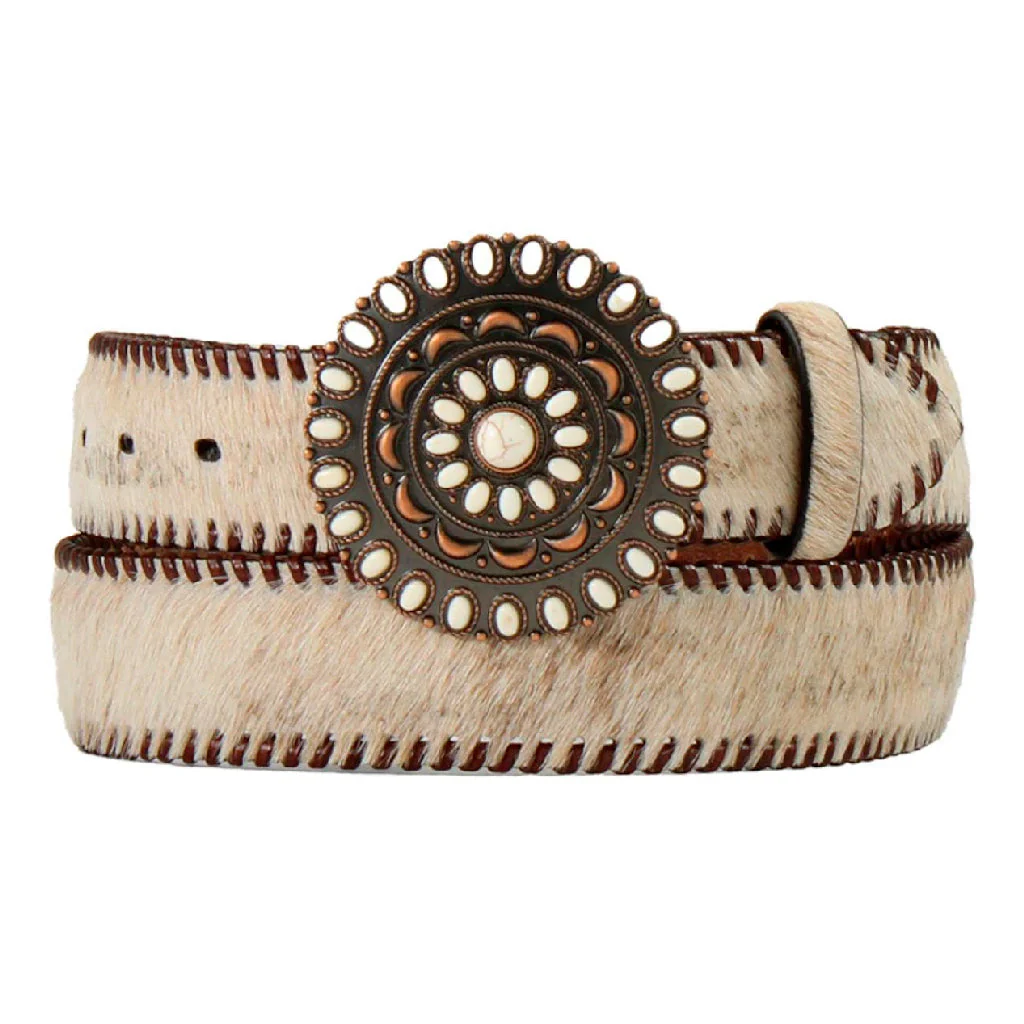 Cinturón Nocona N320006237 para mujer, de pelo de becerro con pespunte, color marrón claro y beige. Cinturón Nocona para mujer de M&F Western Products. La correa de cuero genuino está hecha de pelo de becerro claro, con un pespunte marrón en los bordes. Perfectamente acentuado con una hebilla circular de cobre con piedras blancas.