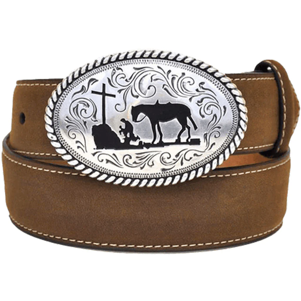 El cinturón Nocona para niño de M&F Western Products ® es perfecto para darle a tu pequeño ese estilo occidental. Cuenta con una correa desgastada de color marrón medio. También viene con una hebilla de oración de vaquero plateada y un diseño de volutas florales. Tu pequeño querrá usarlo cada