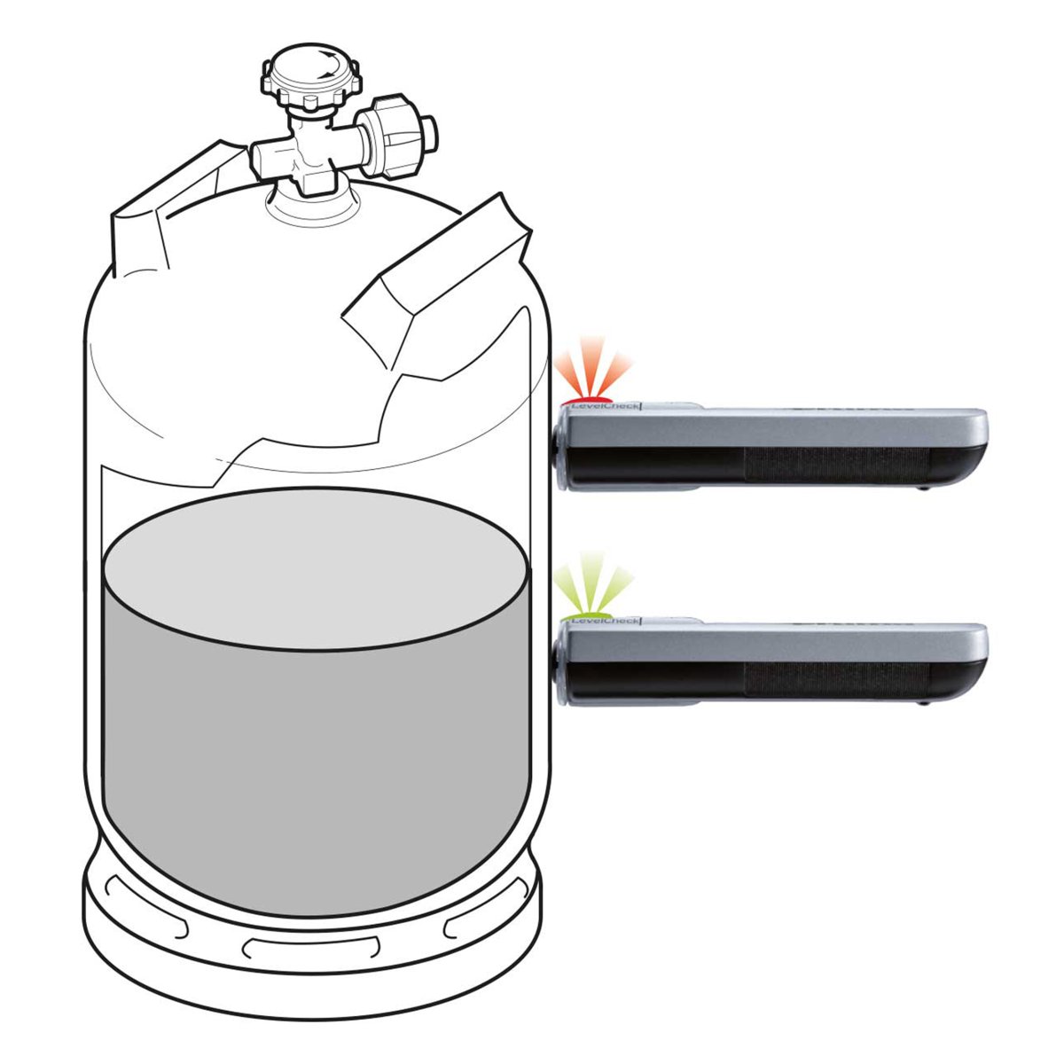 Con el Truma LevelCheck conocerá en pocos segundos el nivel de llenado de su botella de gas. El sensor de nivel de llenado manual detecta mediante ultrasonidos si existe gas licuado en el rango de medición. Solo tiene que colocar el medidor en posición horizontal junto a la botella: habrá gas, si se enciende el LED verde.