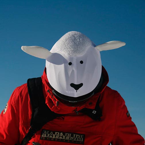 El producto viene en un blister totalmente personalizado de oveja blanca, con imágenes del casco con su funda de oveja blanca e instrucciones de uso.