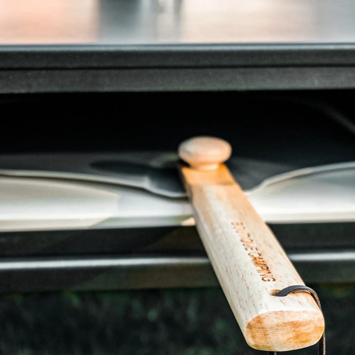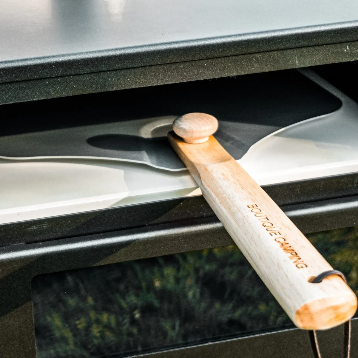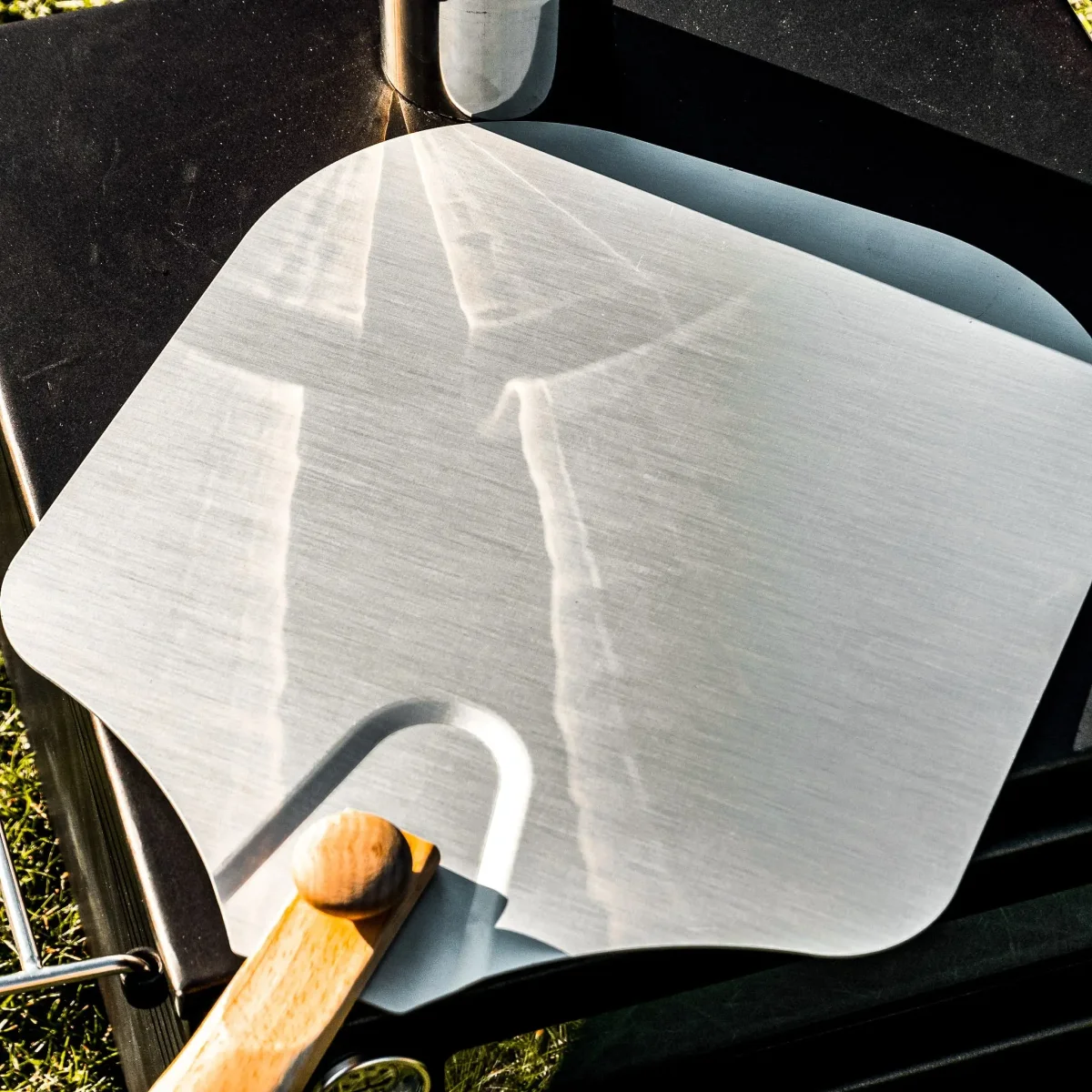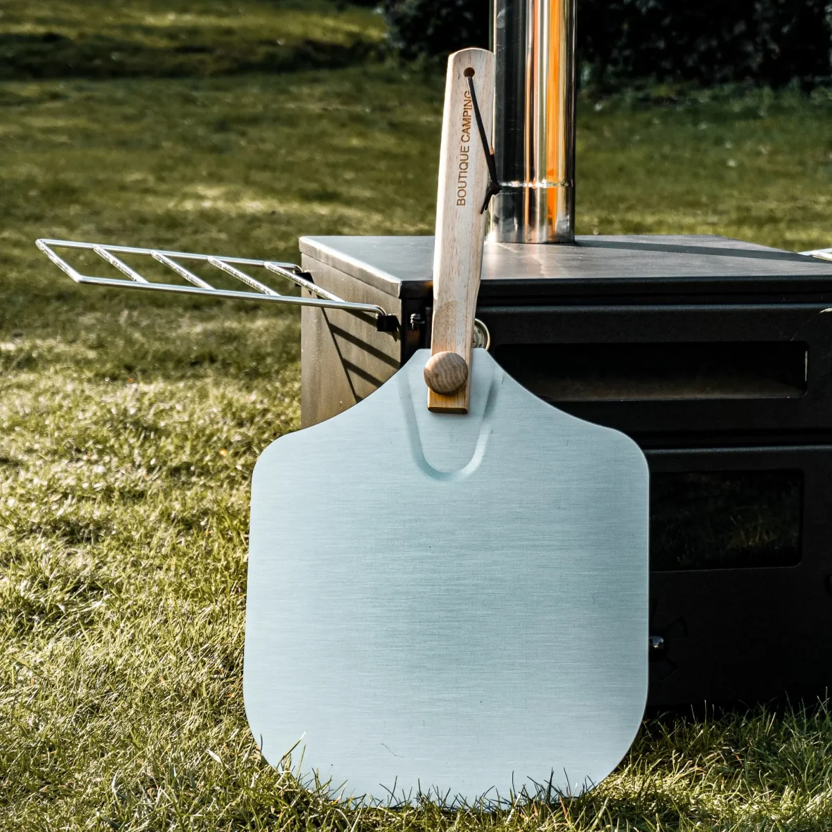Avoid any pizza serving disasters and accompany your Wood Burning Pizza Stove with our very own Boutique Camping branded pizza shovel. Sprinkle a little flour and you’ll find that this non-stick aluminium board is perfect for creating and building your pizza on, additionally to this, it’s the perfect size when rolling out dough, acting as a size guide to keep within the 12″ oven space.