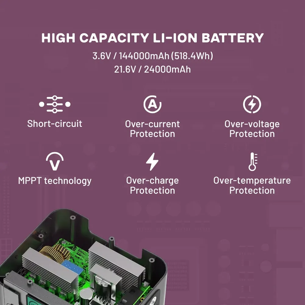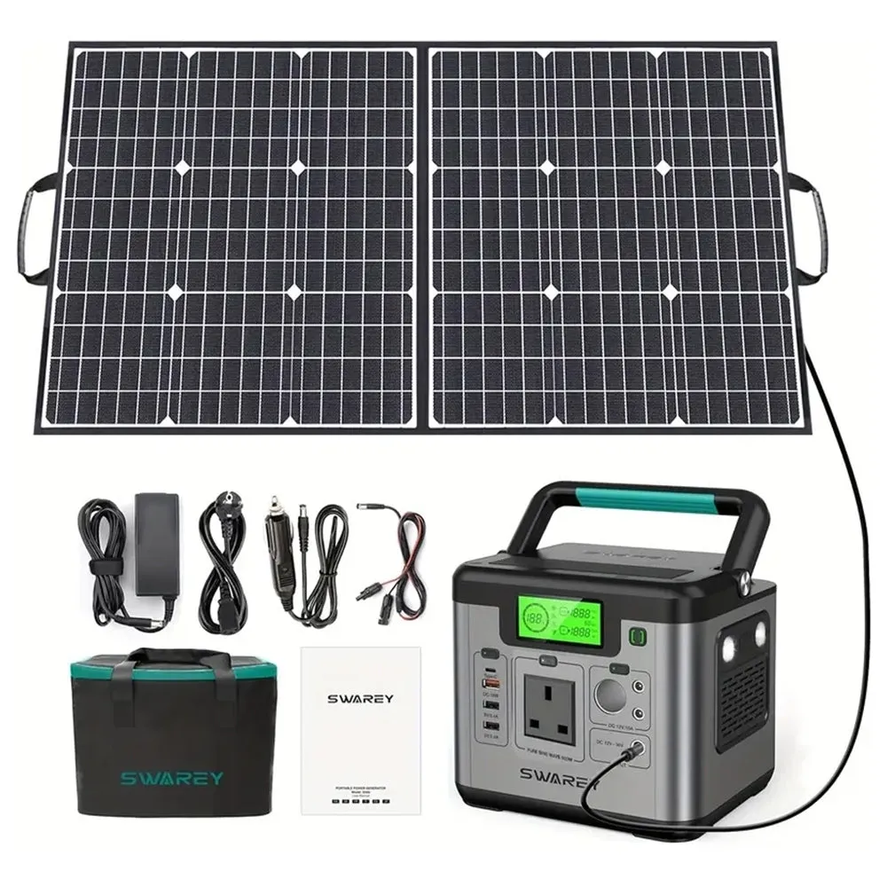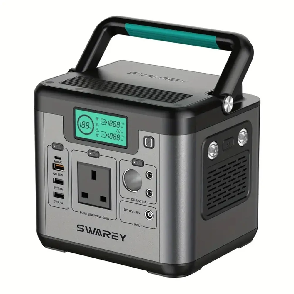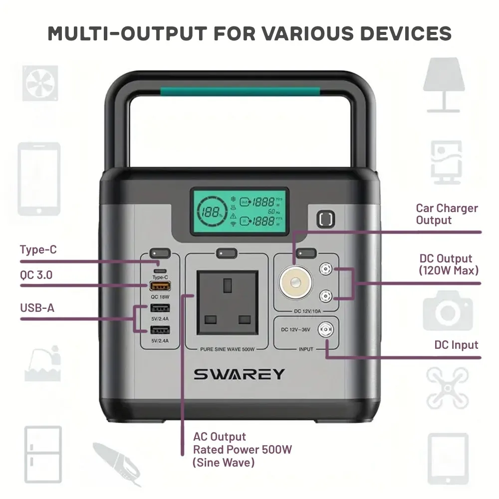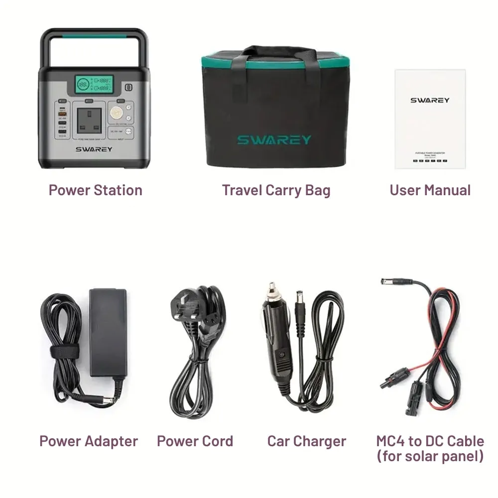 SWAREY Portable Power Bank with 100W Solar Panel, Power Station 518 Wh, Solar Generator 500W AC Output, 65 W USB-C Port, Power Generator Battery for Party, Travel, Camping, Motorhome, Emergency