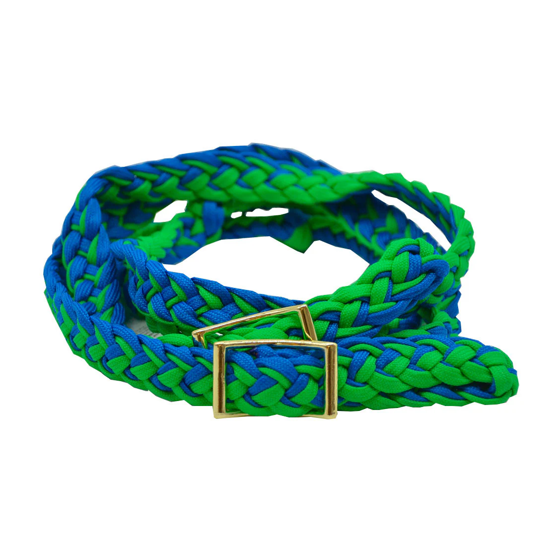 Nylon trenzado plano con revestimiento de cera y cordones de colores en el borde para darle un toque de color. Rein presenta un Conway niquelado y extremos de gatillo. Tamaño 3/4 ″ x 8 ′.