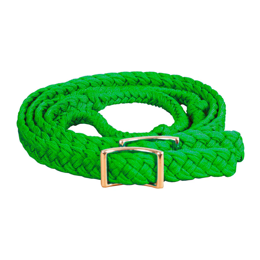 Nylon trenzado plano con revestimiento de cera y cordones de colores en el borde para darle un toque de color. Rein presenta un Conway niquelado y extremos de gatillo. Tamaño 3/4 ″ x 8 ′.