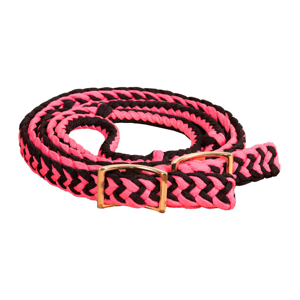 Nylon trenzado plano con revestimiento de cera y cordones de colores en el borde para darle un toque de color. Rein presenta un Conway niquelado y extremos de gatillo. Tamaño 3/4 ″ x 8 ′.