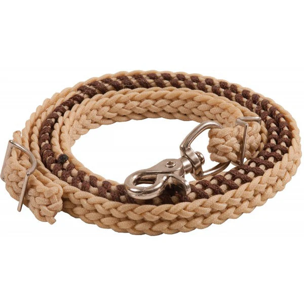 Nylon trenzado plano con revestimiento de cera y cordones de colores en el borde para darle un toque de color. Rein presenta un Conway niquelado y extremos de gatillo. Tamaño 3/4 ″ x 8 ′