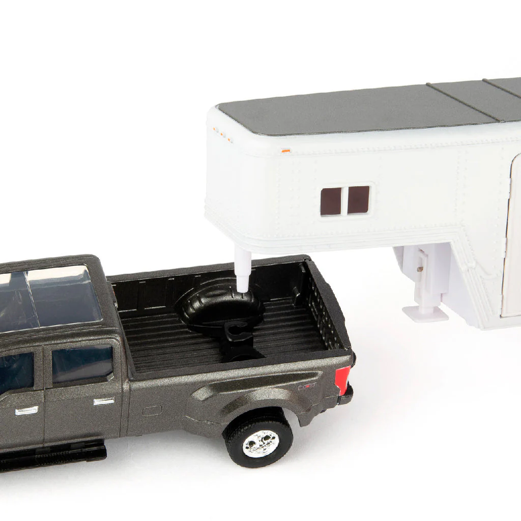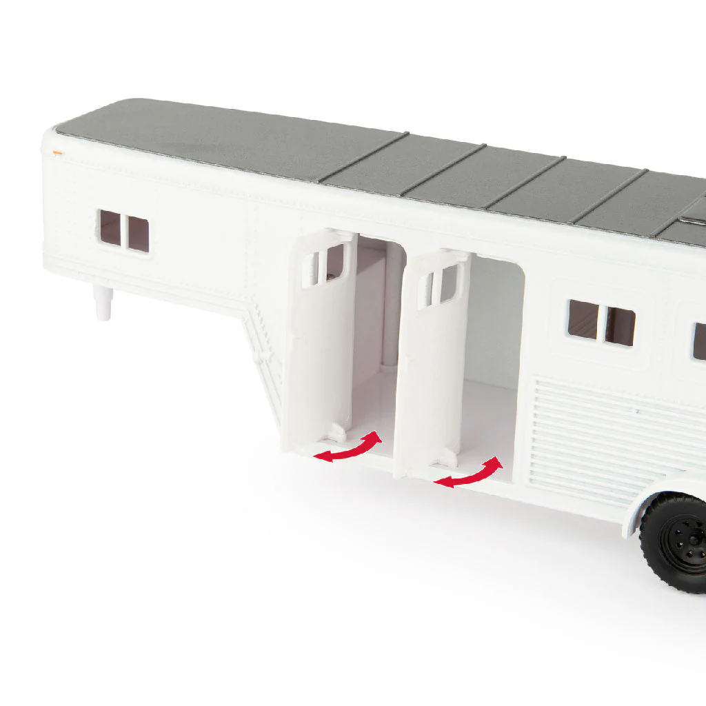 Este set de hobby a escala 1:32 incluye todo lo que el pequeño amante de los caballos necesita para empezar su propia granja. Incluye la camioneta Ford F-350 2017 a escala 1:32, un remolque para caballos, tres caballos, un minicargador John Deere y un caimán, además de pacas cuadradas pequeñas y una cerca