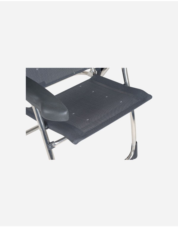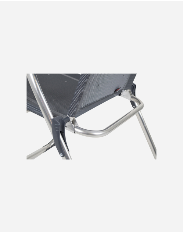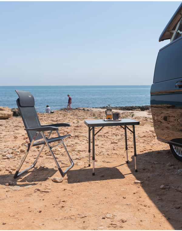 Butaca fabricada en aluminio Serie Compact: Plegado extra plano en 5 cm y cabezal regulable en altura que ahorra 16 cm en su posición plegada. 7 posiciones de respaldo, respaldo extensible. Especialmente diseñado para campers. Máxima comodidad en mínimo espacio.