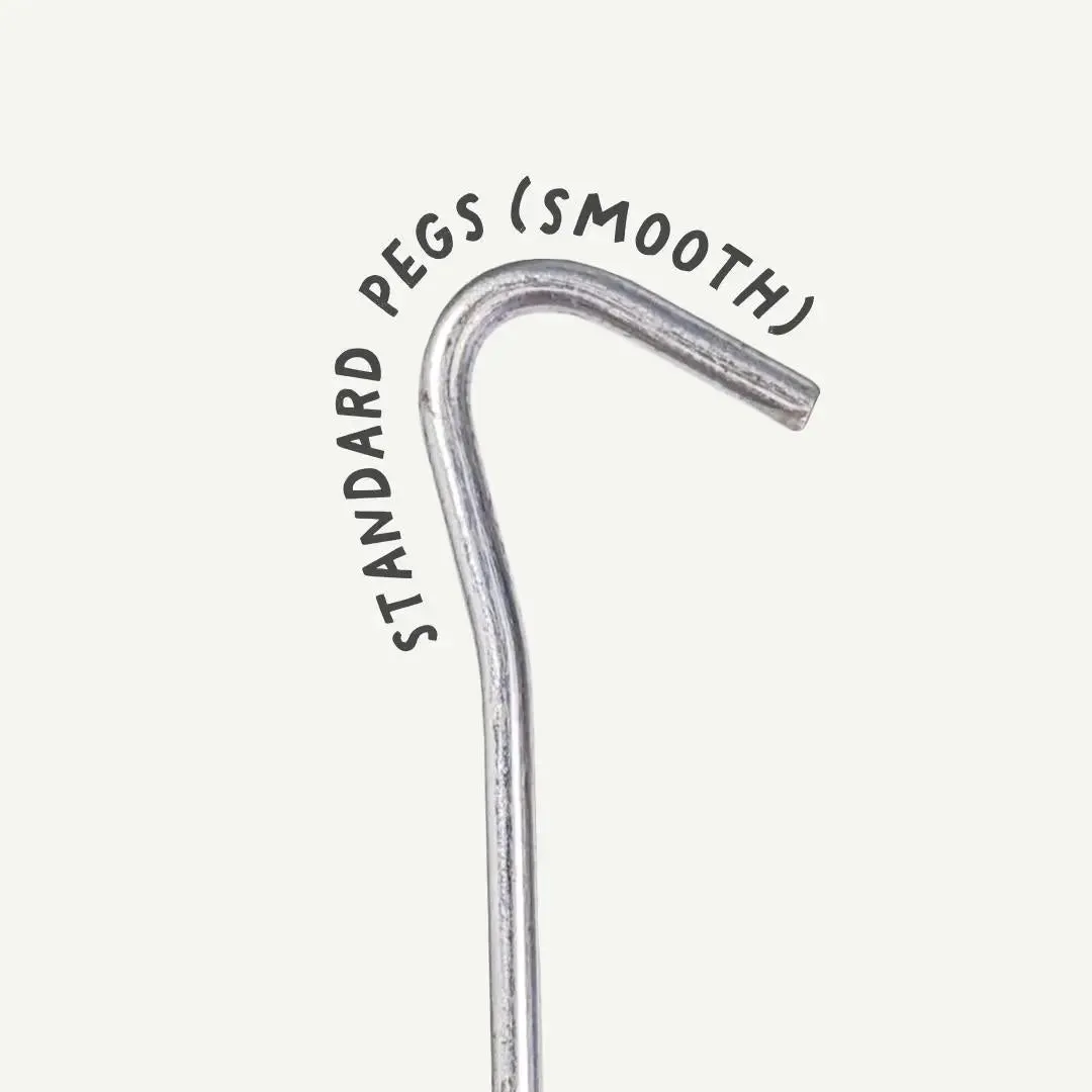 Standard are the smooth smaller pegs used for the groundsheet and the super strong ridged rebar pegs are for the guy ropes or webbing. Both variants are available in 10 and 20 packs.