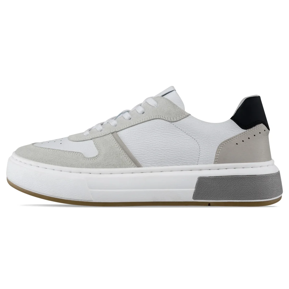 Zapatos casual-deportivos con cordones planos. Elaborados en cuero con piezas en gamuza, costuras decorativas, microperforaciones, forro textil acolchado, plantilla en sintético y suela en TR bicolor con volumen y costura de refuerzo.
